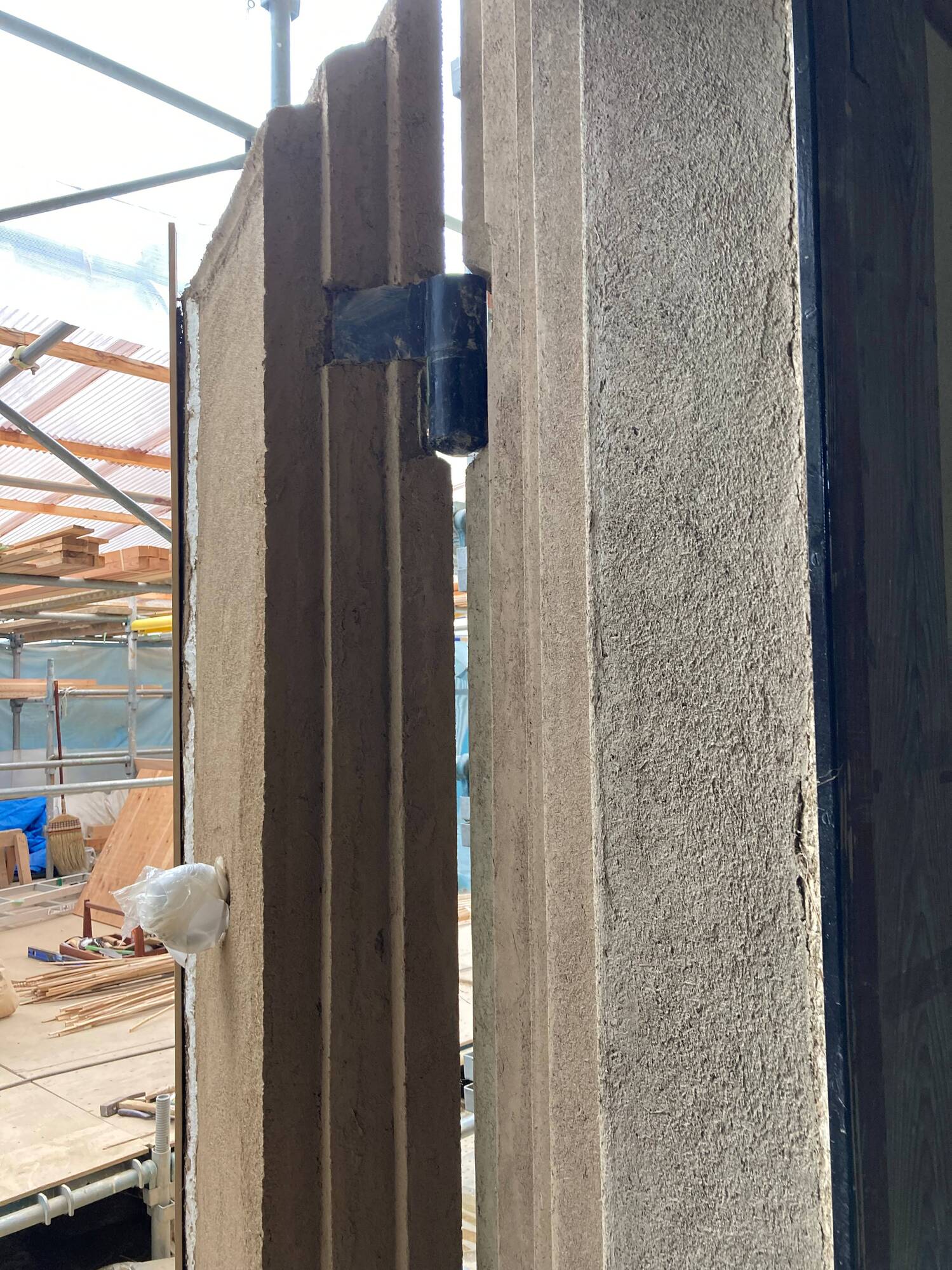 「今は大きな藁の入った荒木田土で、強度を高めるための縄を入れながら塗っているところです。最終的には200~230ミリの厚さに仕上げるんですが、扉は形を作るのが難しいんです。たぶん扉が一番難しいんじゃないかなあ」