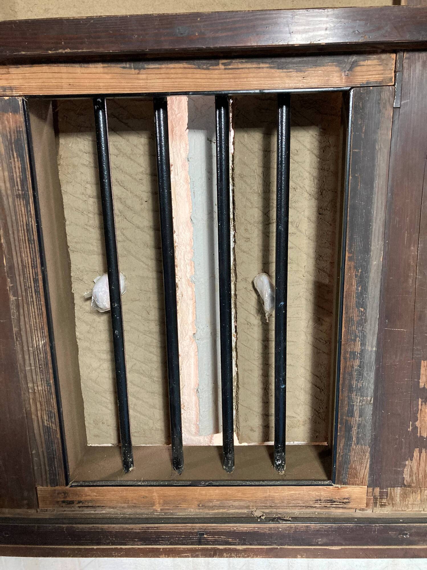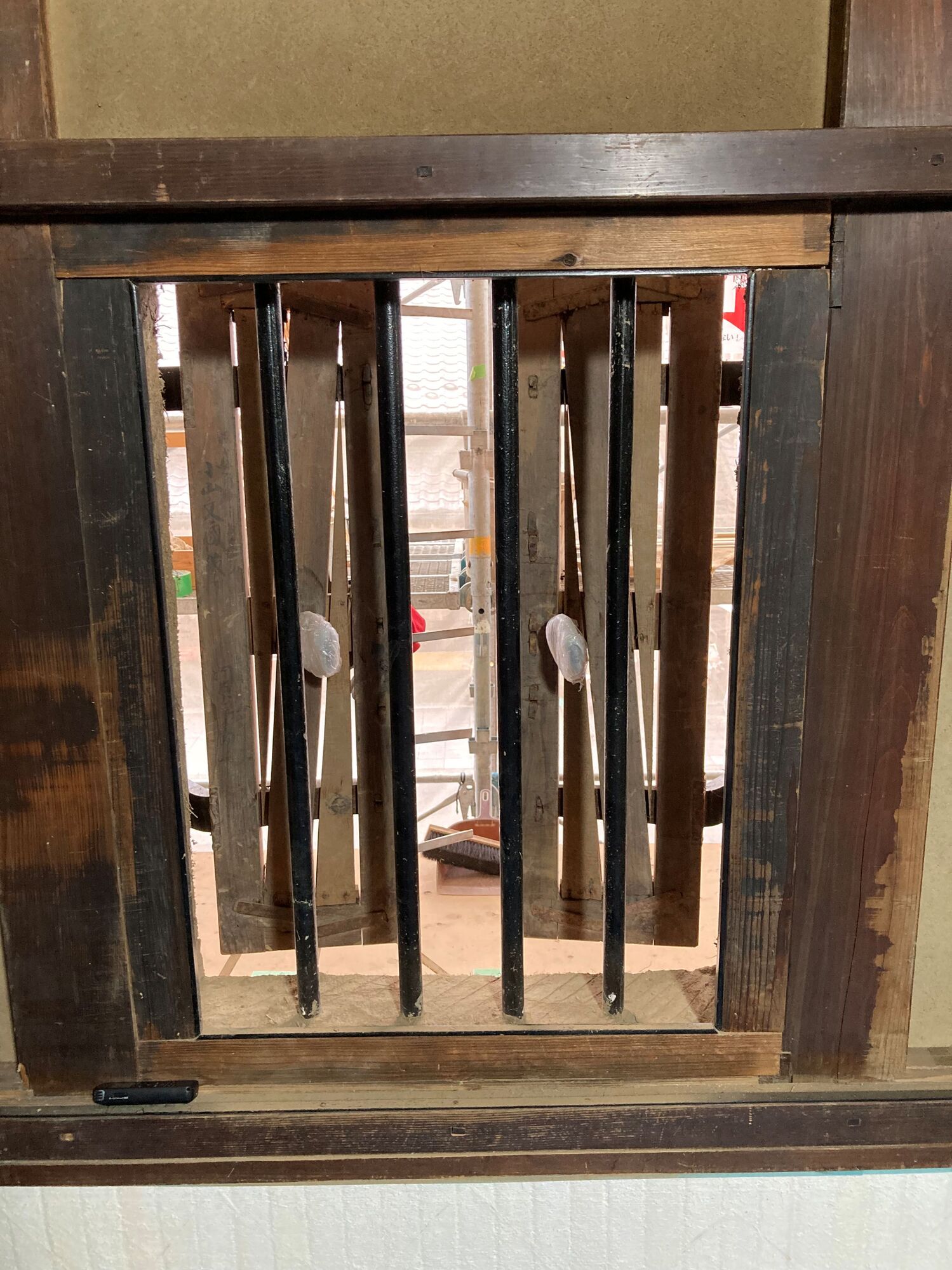 蔵の窓の扉も、1階の大きな扉と同じ3段の階段状になりますが、この時はまだ下地の板がそのまま見えていたのもあれば、最初の塗りが終わった状態のものもある状態でした。