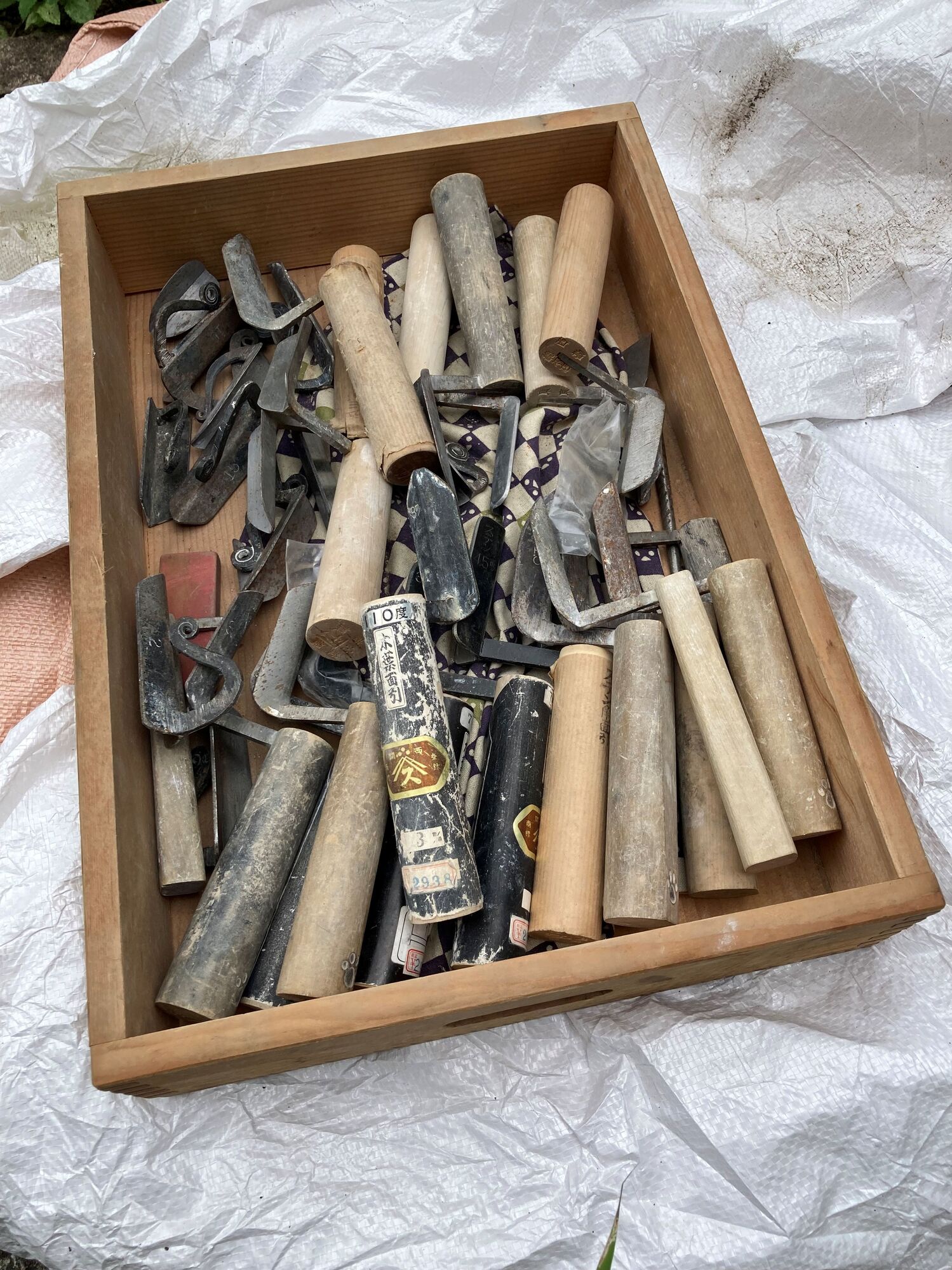 長谷さんがいろいろな鏝の入ったケースを持ってきてくれました。形や大きさもさまざまですが、素材も違うようです。