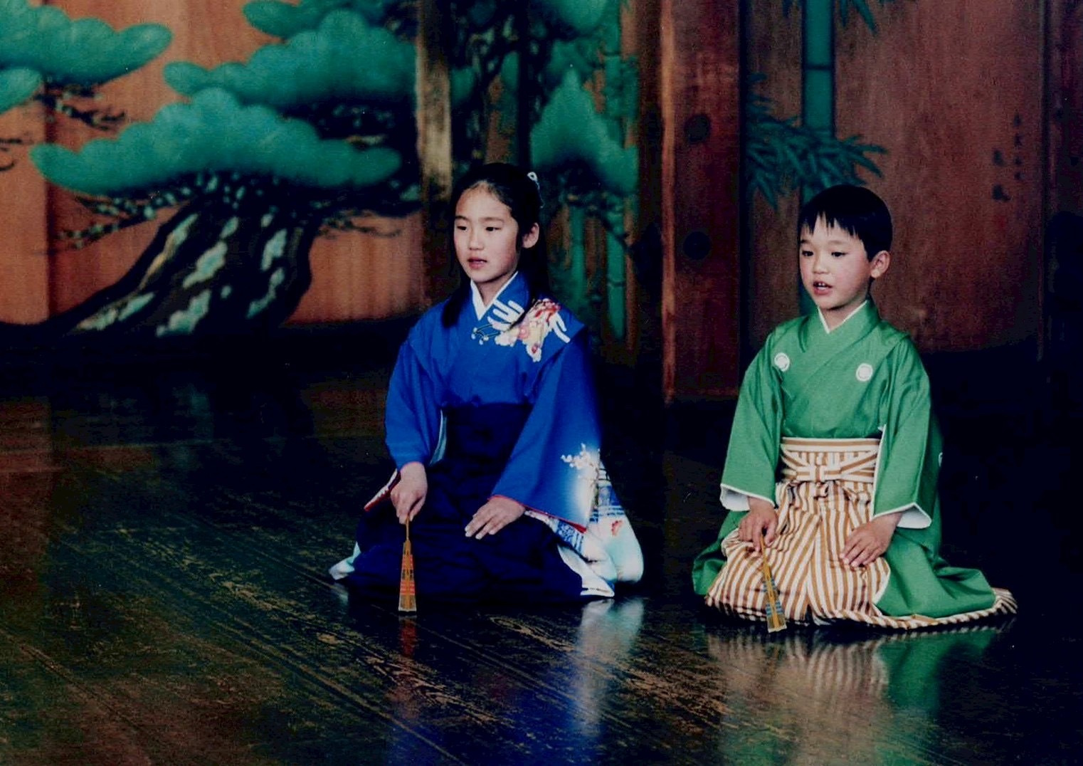 私には三歳年上の姉がいます。この頃には姉とともに、京都市内のシテ方の先生のところへ謡(うたい)と仕舞(しまい)のお稽古に通っていました。謡とは、お能の詞章を決まった節(ふし)や発声で謡うもの。仕舞は、装束や面(おもて)をつけずに、お能の一部の舞や所作を謡に合わせて舞うもの。能楽師は、楽器を演奏する囃子(はやし)方の場合でも、まずは能楽の基本となる謡と仕舞からお稽古を始めます。