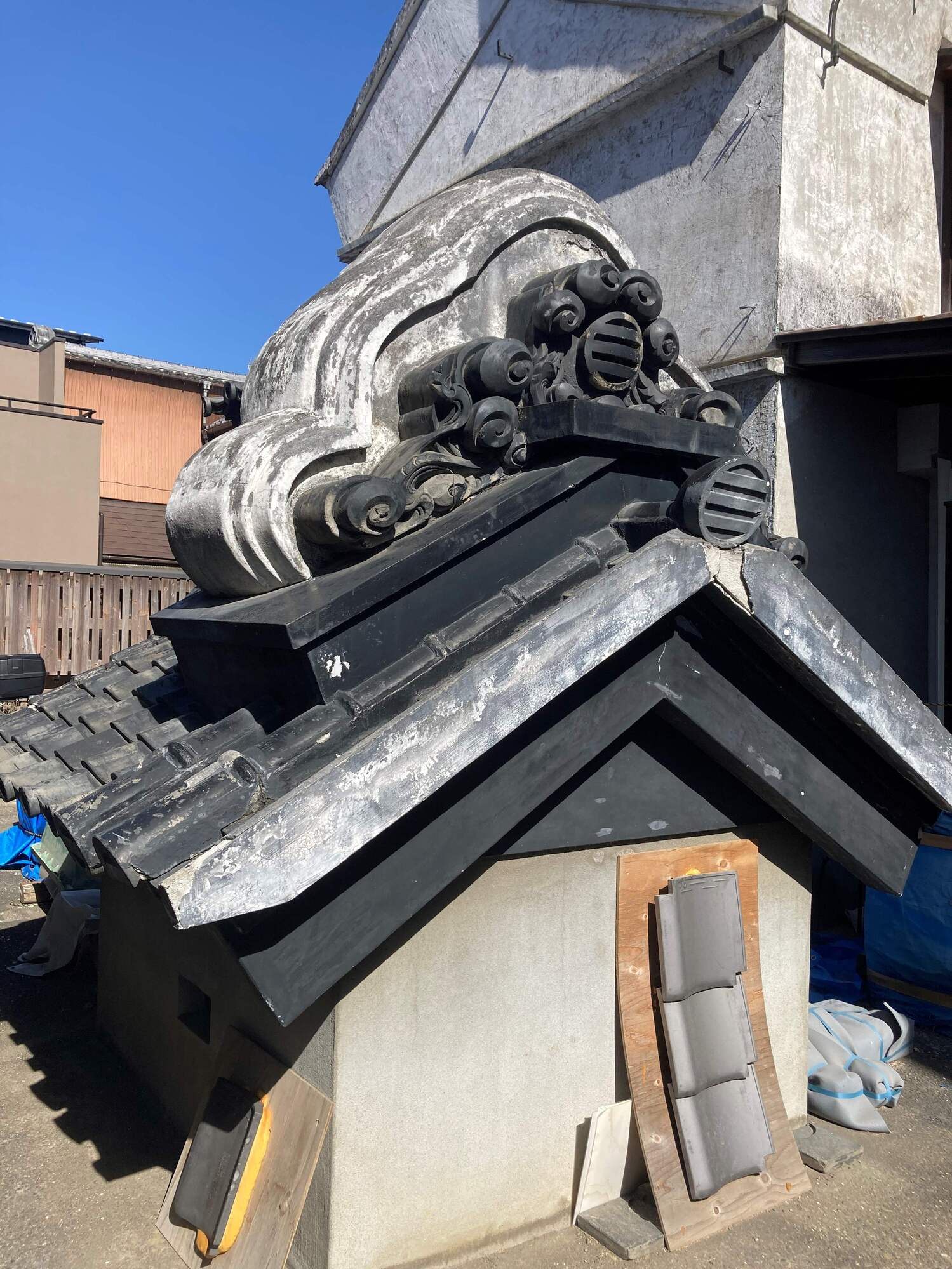 「あれは鬼台 (おにだい)を成形しています。瓦が全部載ったので、屋根の役物(やくもの)を作っているんですよ」