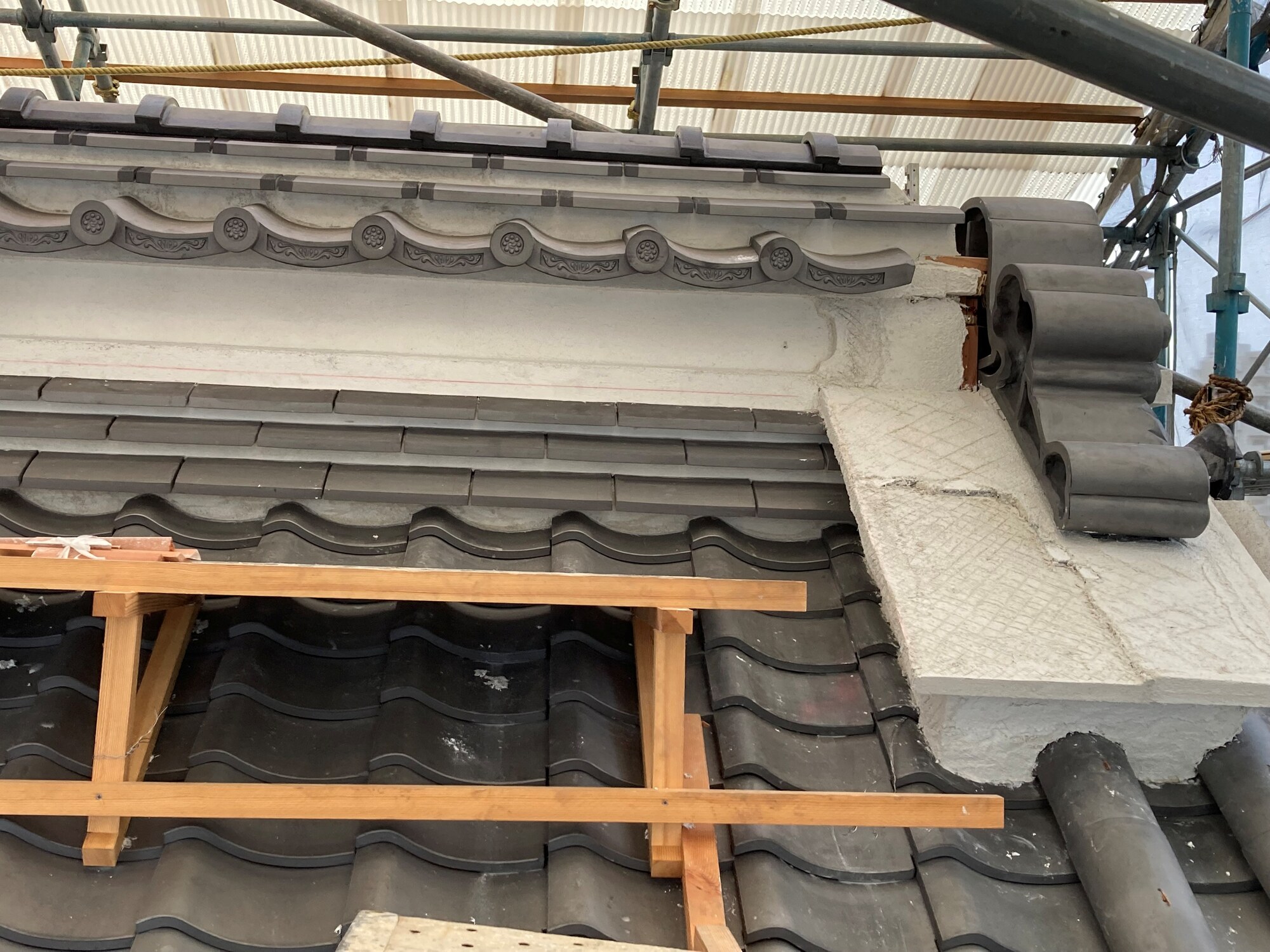 屋根における役物とは、鬼瓦、ケラバ(螻羽/後述)、軒先などがあります。鬼台も役物で、鬼瓦を受けるもののことです。写真で見てわかるように、鬼瓦のすぐ下に鬼瓦を載せている白っぽい台がありますが、これが鬼台です。