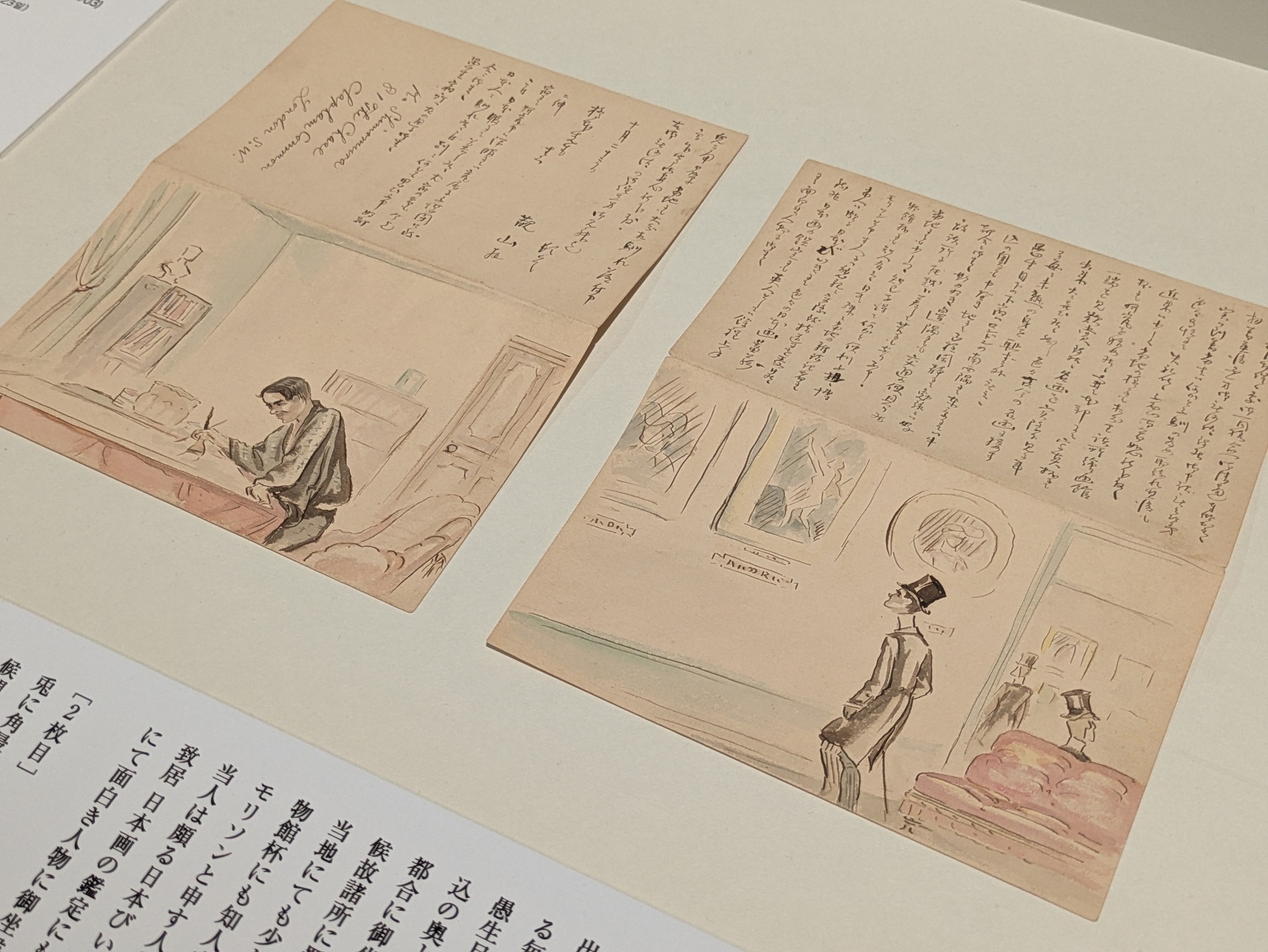 ロンドン到着から約半年後、13歳からの師である画家・橋本雅邦(がほう)に宛てて出された近況報告の手紙。絵画を展示する博物館の様子や、下宿では和服姿で研究制作に励んでいることを伝える絵は、ちょっとコミカルで、留学の充実ぶりが窺えます。
