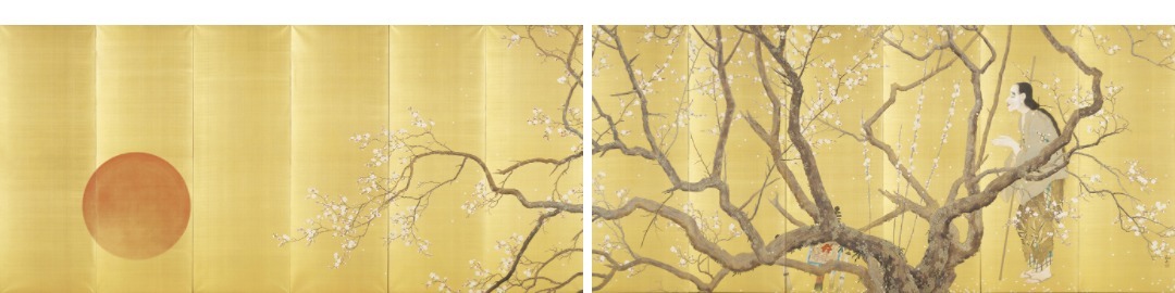 やはり金一色に塗り込められた背景に、ぽつんと佇む俊徳丸。近くで見ると、まぶたが落ちくぼみ、髪はほつれ、うっすら髭がのび、みすぼらしい身なり。ですが、まばゆい光に包まれ、夢見るようにうっすらと口元に笑みを浮かべています。今を盛りと咲く梅の花びらが、彼の体に降りかかります。彼が手を合わせ向かうのは、画面の最も遠くに描かれた、沈みかかる日輪。潔い画面構成の空間に、清らかな梅の芳香が漂い、見えないものを見ている主人公の心象風景が濃密に表現されていて、圧倒されます。能楽自体がある種「見えないものを見る」芸能ですが、この作品にはお能『弱法師』の良い舞台を観たときのような感動を覚えました。