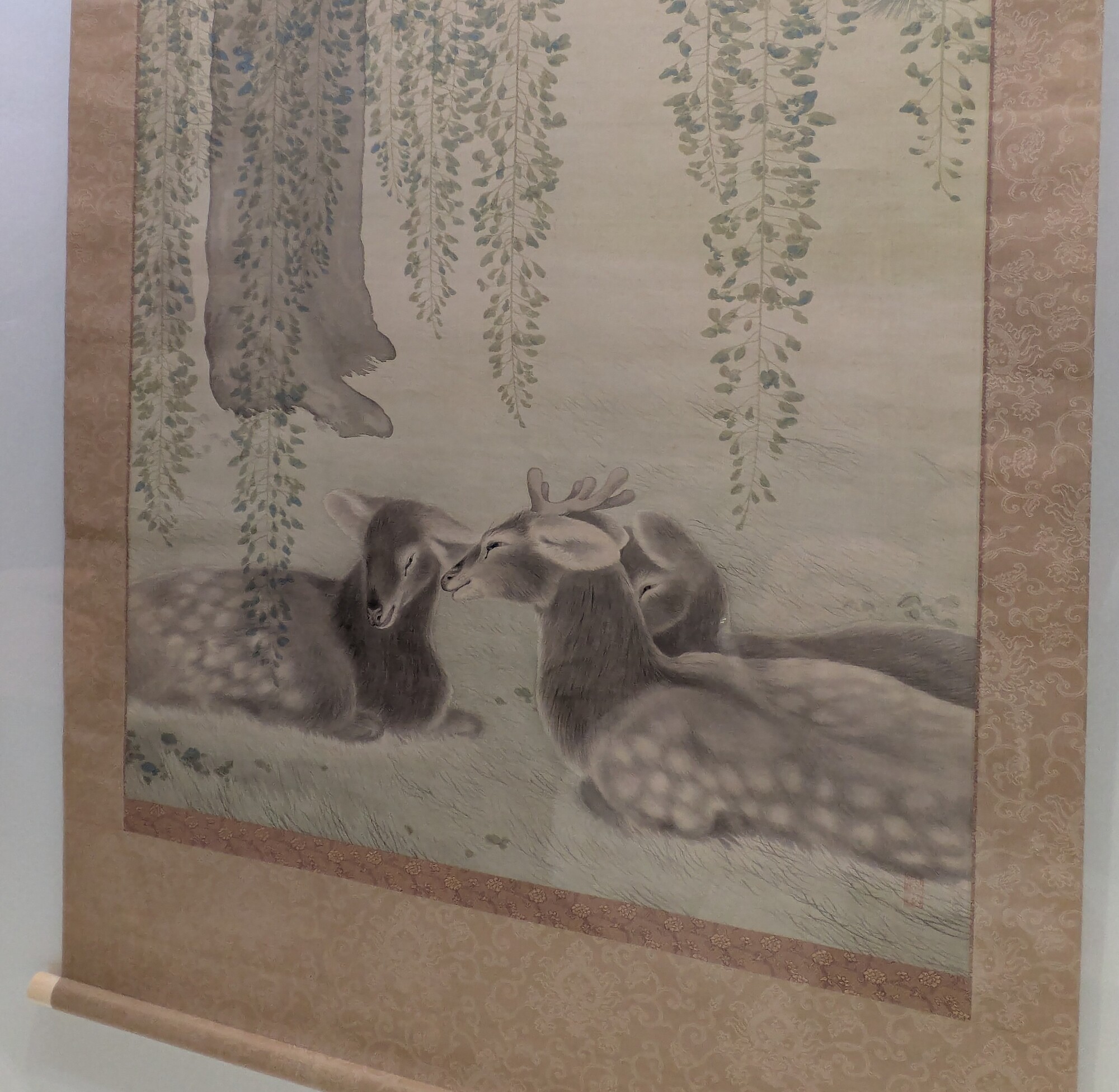 そんな若き日の観山の作品より、奈良・春日野(かすがの)の藤の花のもとでくつろぐ鹿たち。空気を含んだようなやわらかな毛並みに、穏やかな春の日の暖かさを感じます。